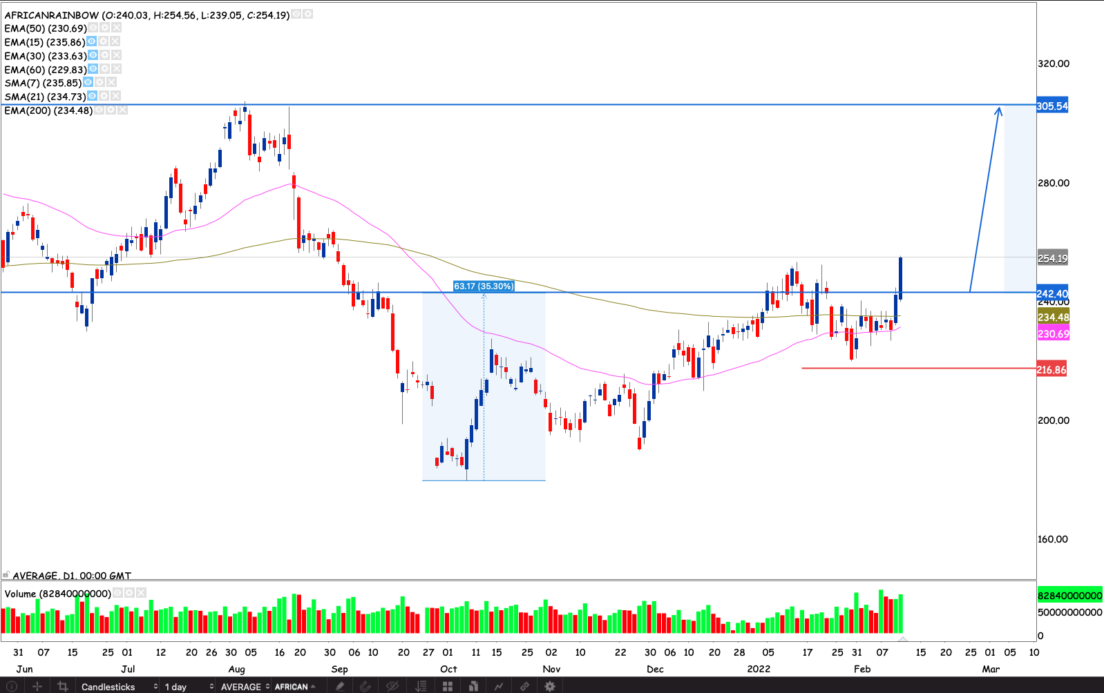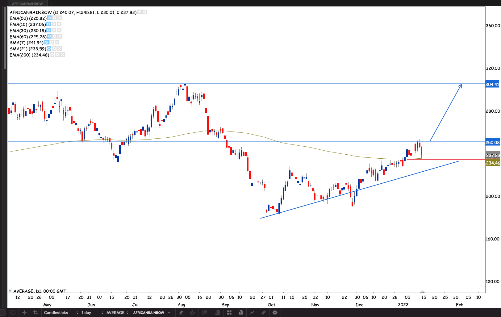 The stock came back above the 200 day EMA for the first time in a while recently. It came back to retest the 200 day EMA on Friday. If the stock breaks R250 there’s a nice place for a R304 target with a R233 just below Friday’s low and the 200 day EMA.
