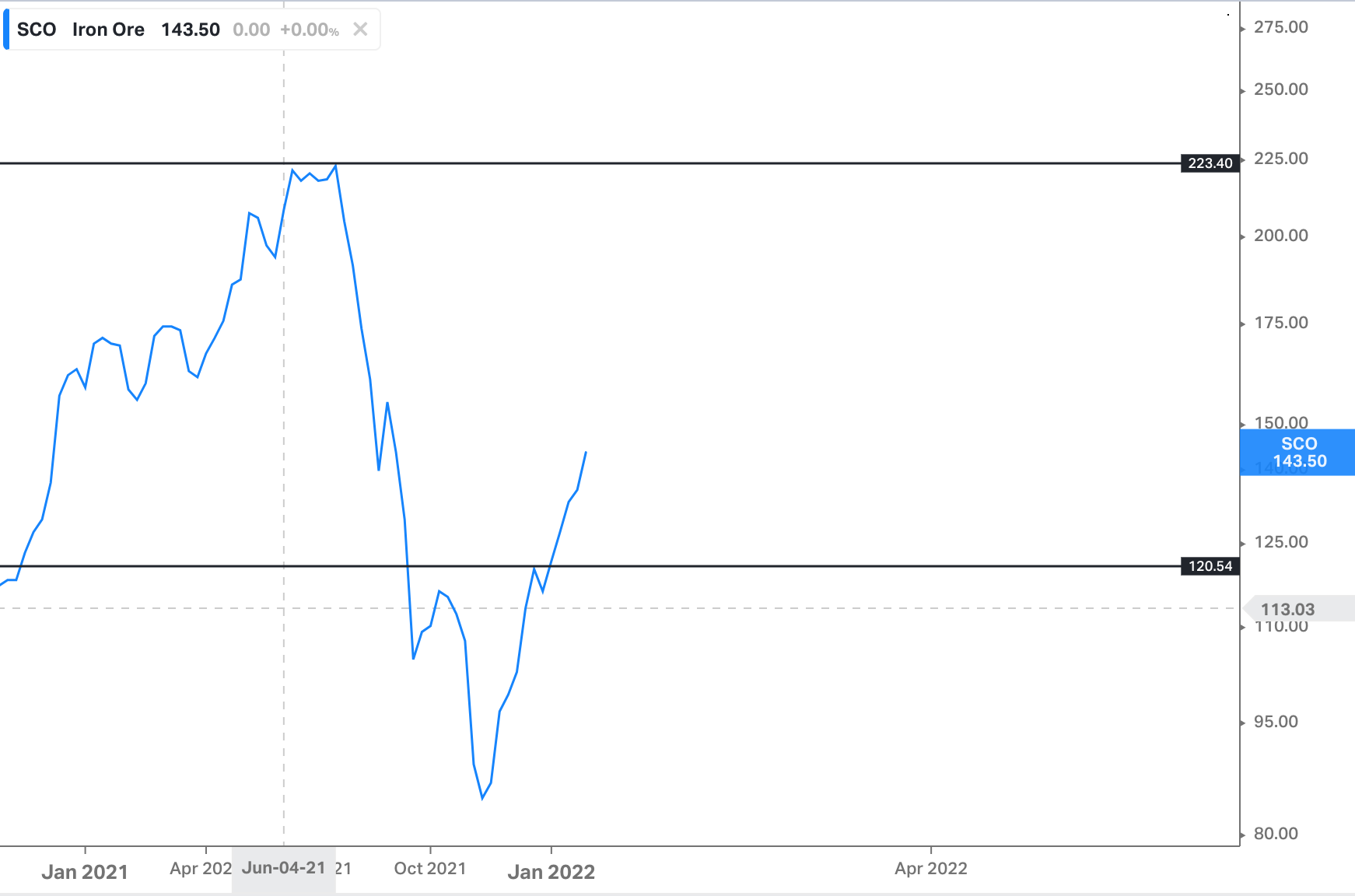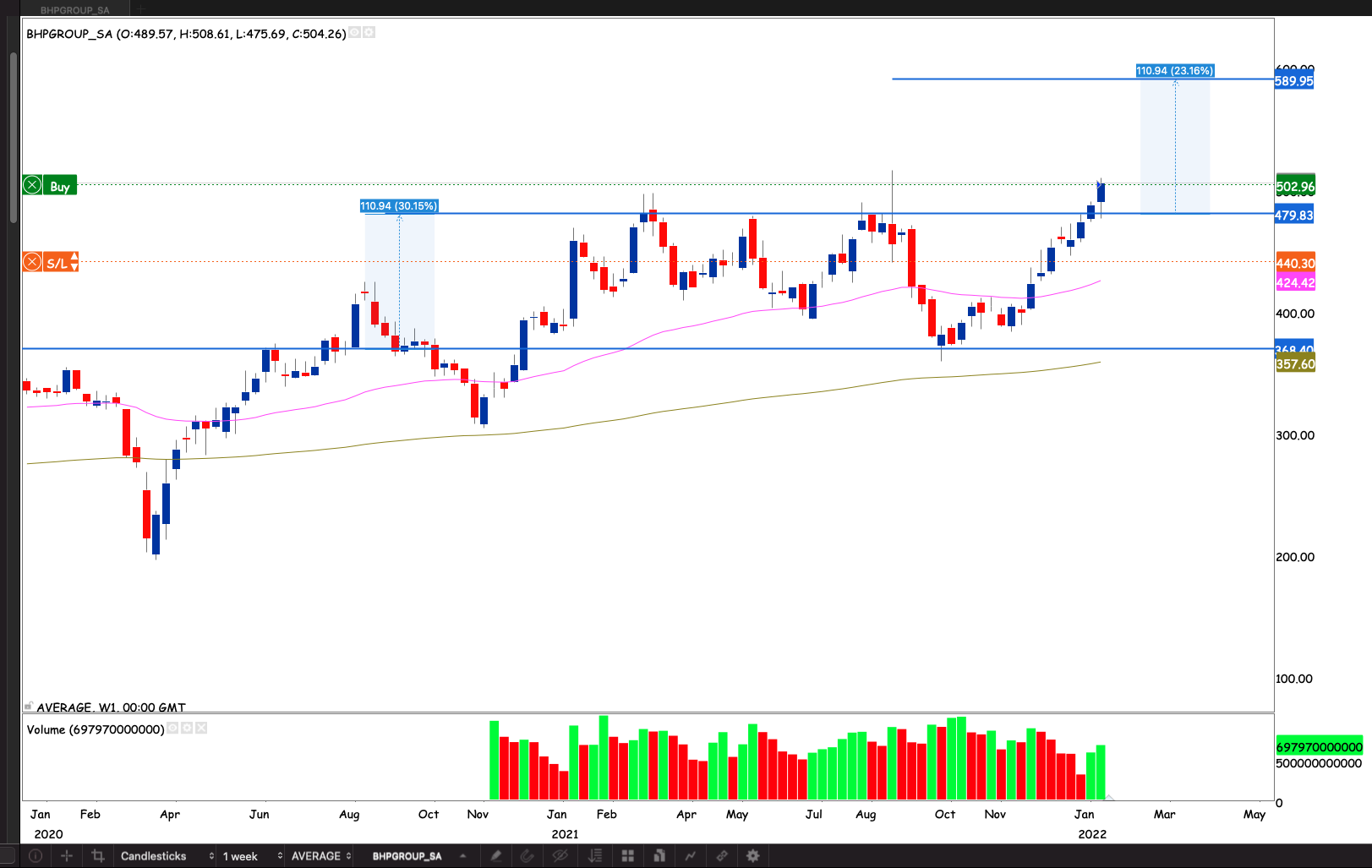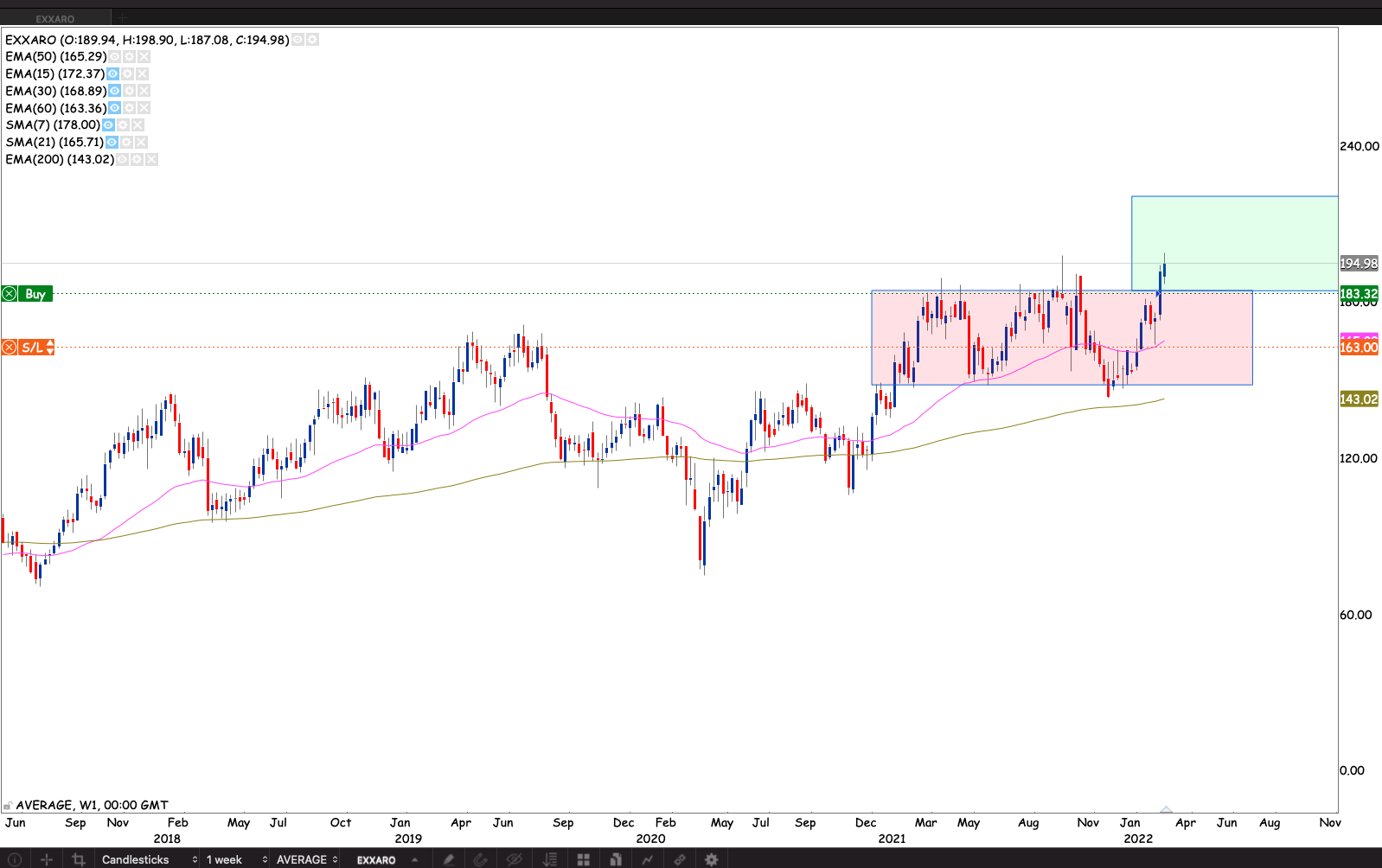 Iron Ore prices have been rallying strongly. I called the stock bottom last November 2021. When I saw a couple of dojis on the week chart around the 200 week EMA. The stock has been ticking higher. I’m building a position in my smaller portfolio. Because the 50 day EMA is still below the 200 day EMA. If Iron Ore prices continue to rally I think the stock will break through R773 fairly easily.