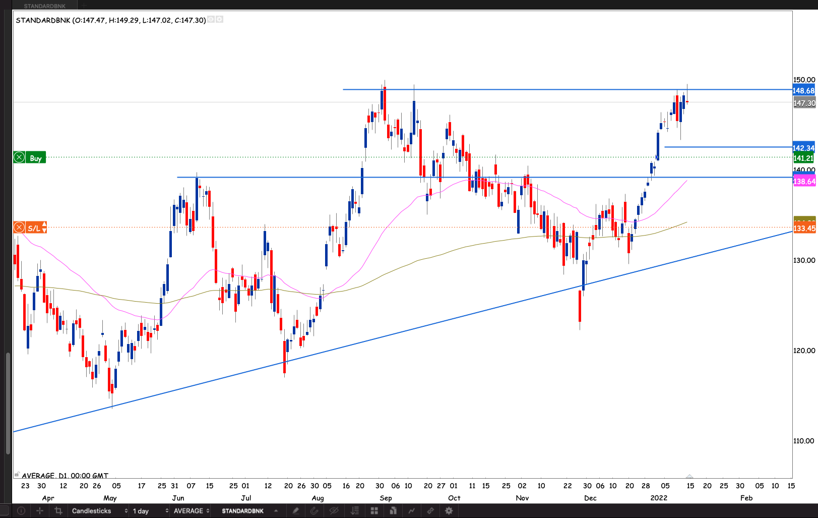 The stock hit the ascending triangle pattern target within a day of the trigger. Lots of updates coming from the company, the market loving all of it. I will now waiting for a close through then I will raise my stop loss to R151.90 which will officially make MTN my biggest winner from jumping Distell. As my profit will rise to +95%