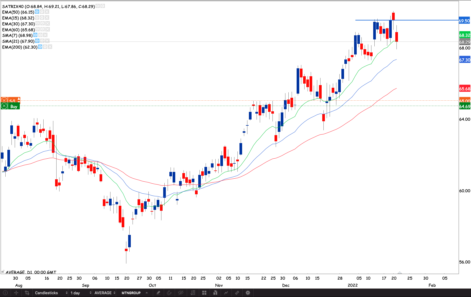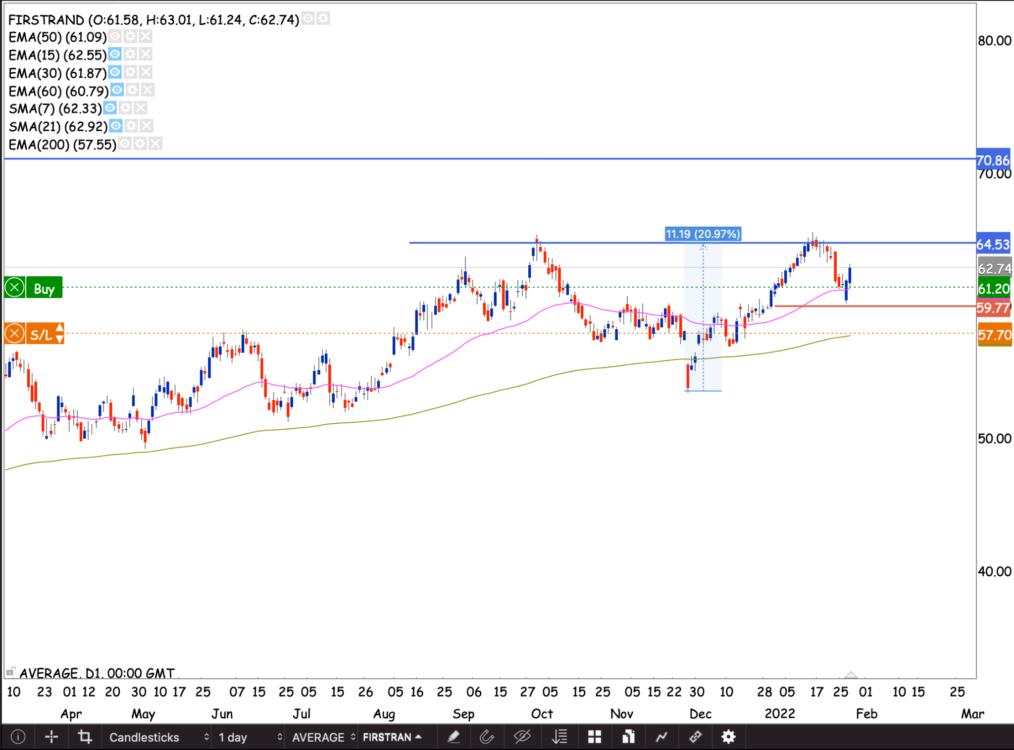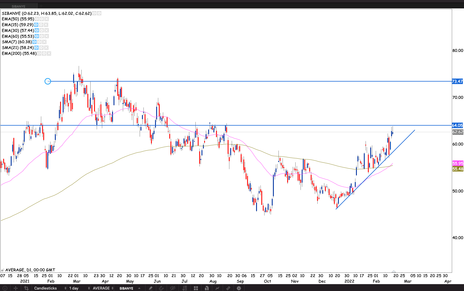 We have a golden cross. I’ve been watching Sibanye for a while now waiting for the golden cross. I suppose it needed a move in gold. I’m watching the R64 old support for an entry signal. My goal will then be to cross R73 with the position still intact having added to it a few times.