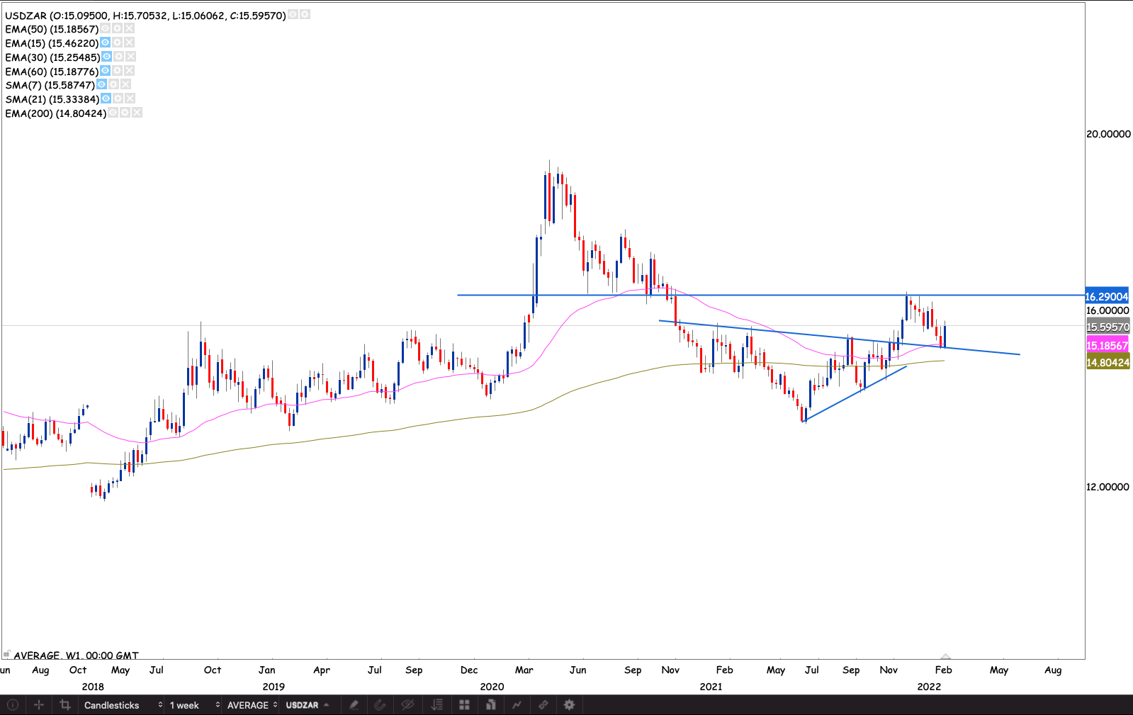 We have a massive symmetrical triangle breakout at the back of the a weekly golden cross. The target of the pattern takes it back to the R192 highs. Providing plenty opportunities on the long side on the daily chart.