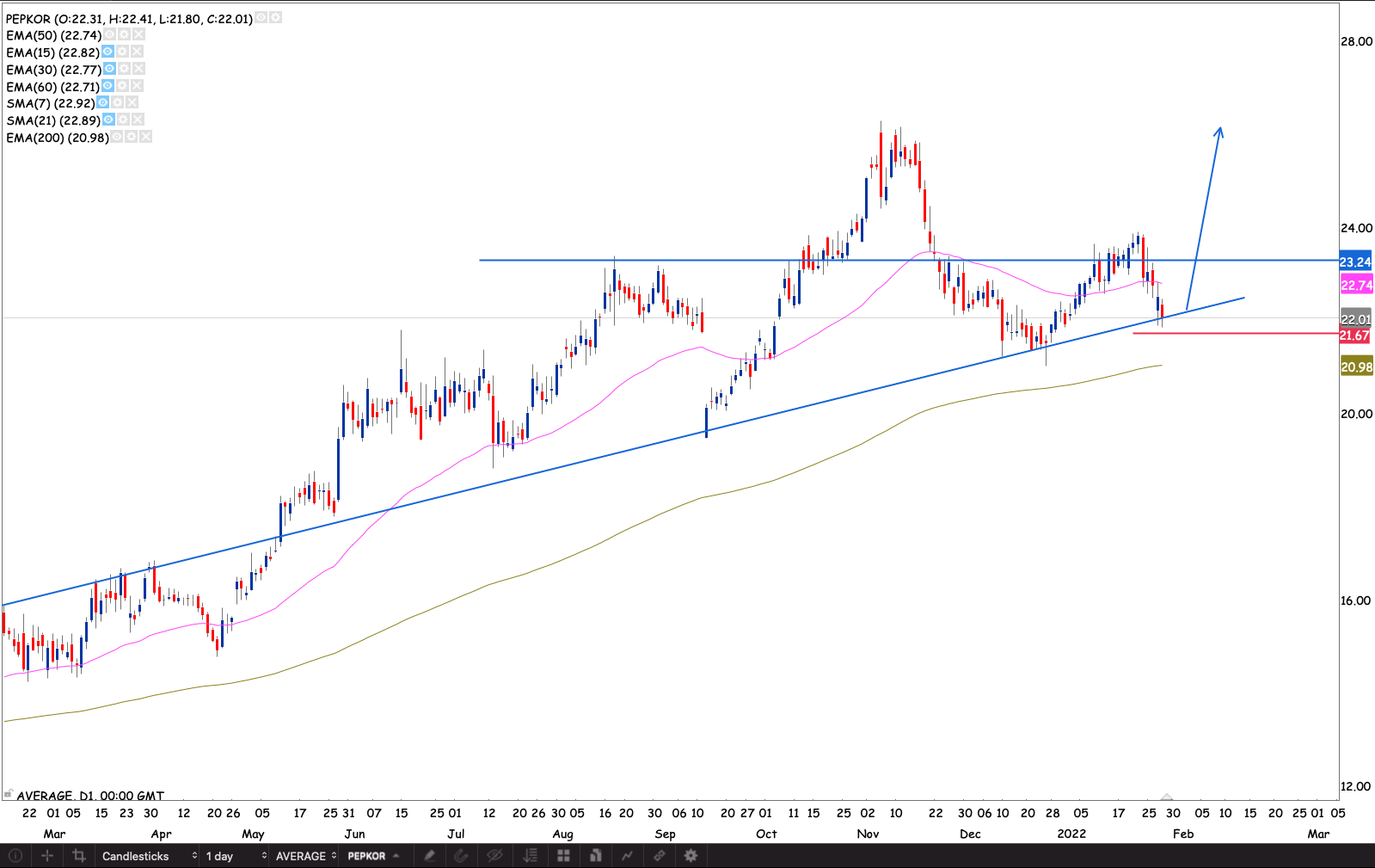 The stock saw a 20% correction right to the uptrend support and turned. There’s a lurking resistance/support at R23. A break above it provides a good buy signal.