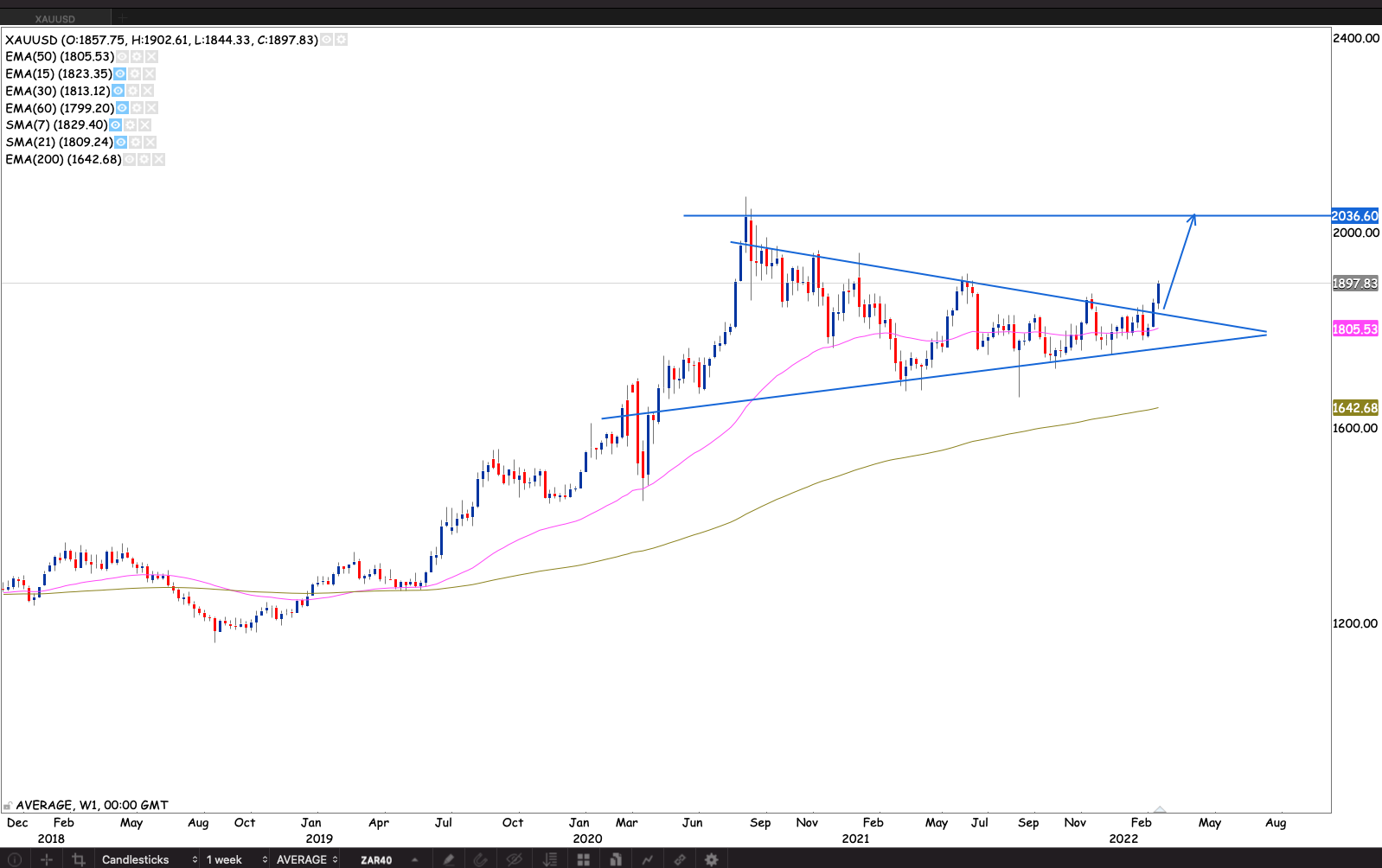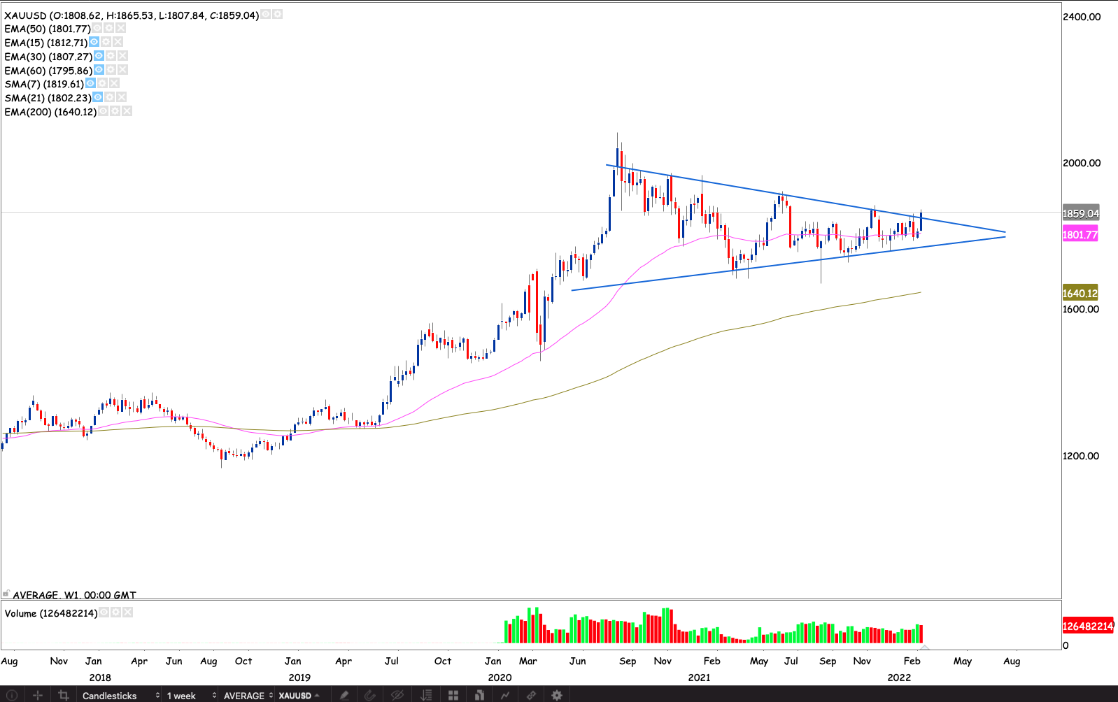 Gold breakout seems to be a valid one. Looking likely to run up to $2063 prior highs. The yellow metal is quite close to make a 52 week high close, if it closes this week above $1902.60 the high is $1916.53.