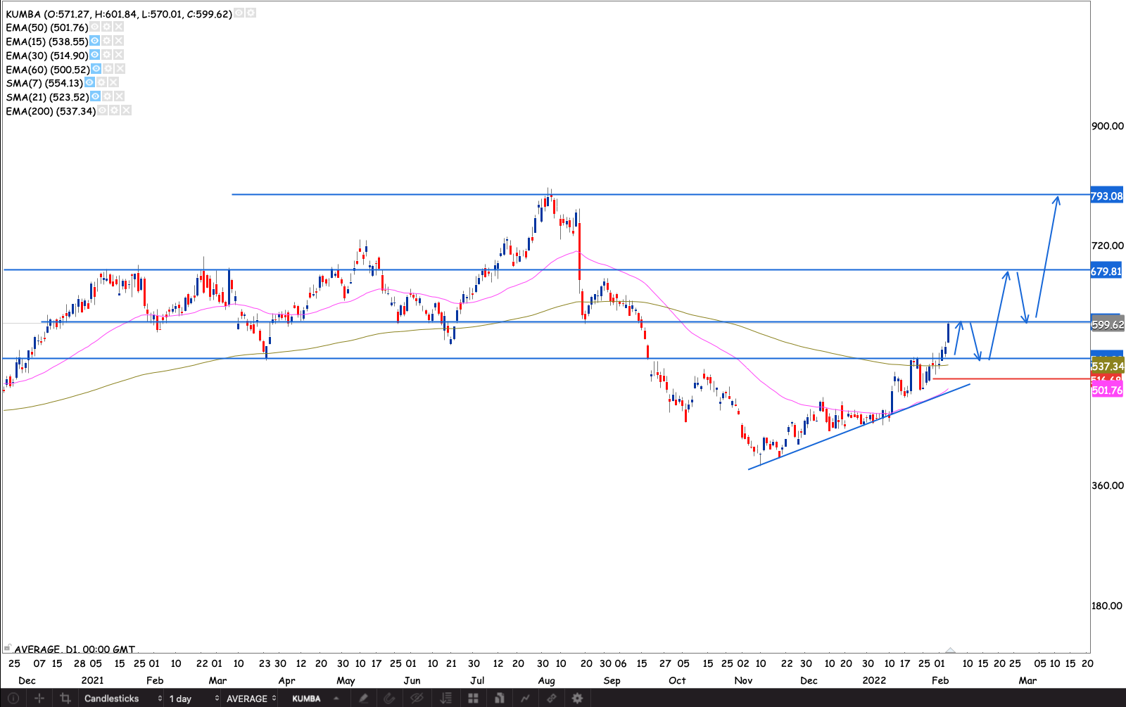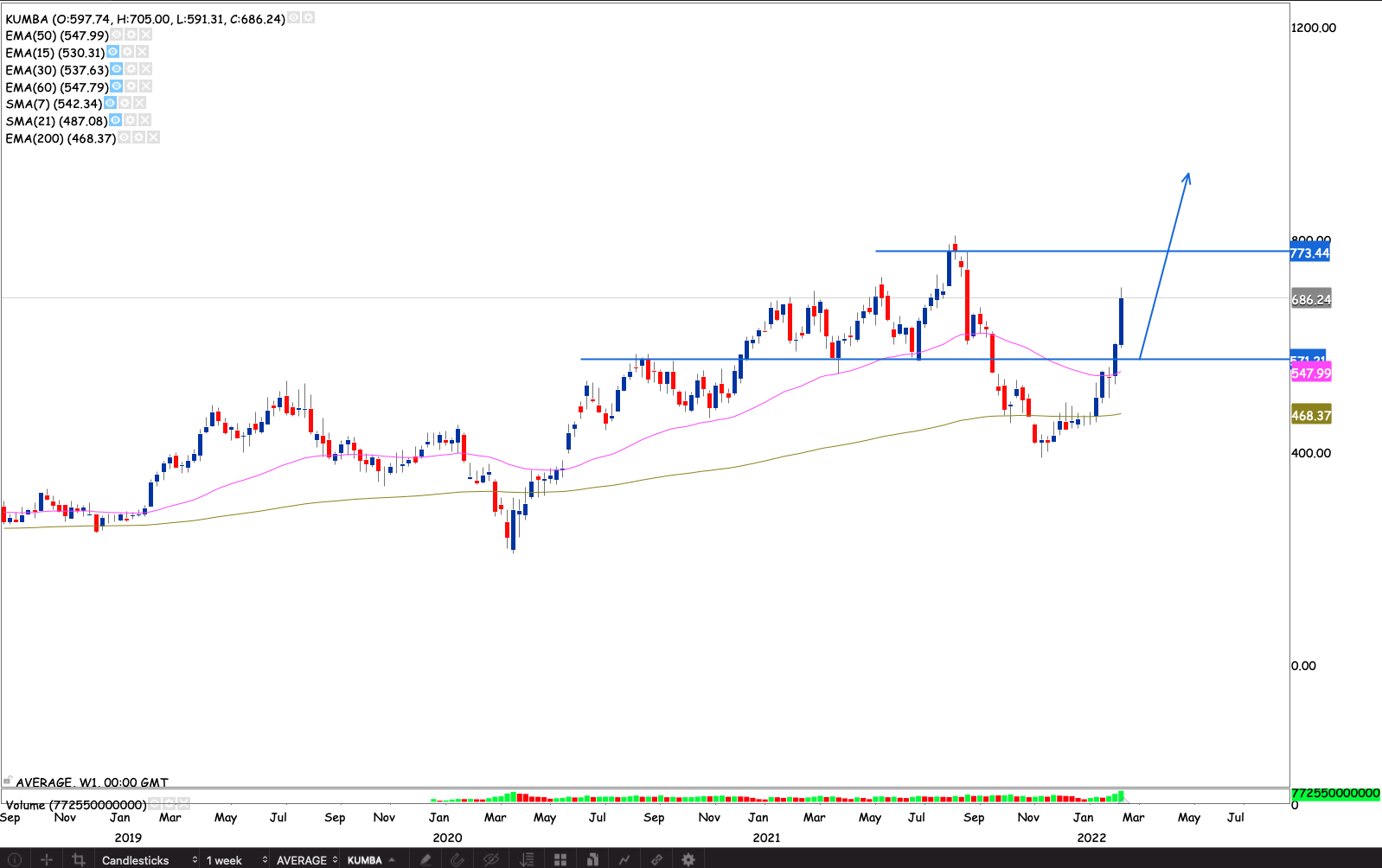 Iron Ore prices have been surging recently. Causing a turn in the Kumba stock. It left the 200 week and 50 week EMAs behind in the last few weeks. We now have a golden cross on the daily chart. Market remembered the R691 resistance as Iron Ore prices experienced a bit of a pull back. I’m expecting the market to trendline as a result. Perhaps forming a cup and handle pattern or an ascending triangle.