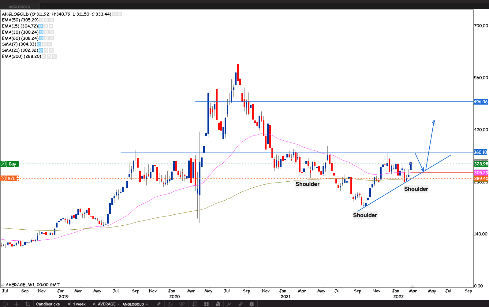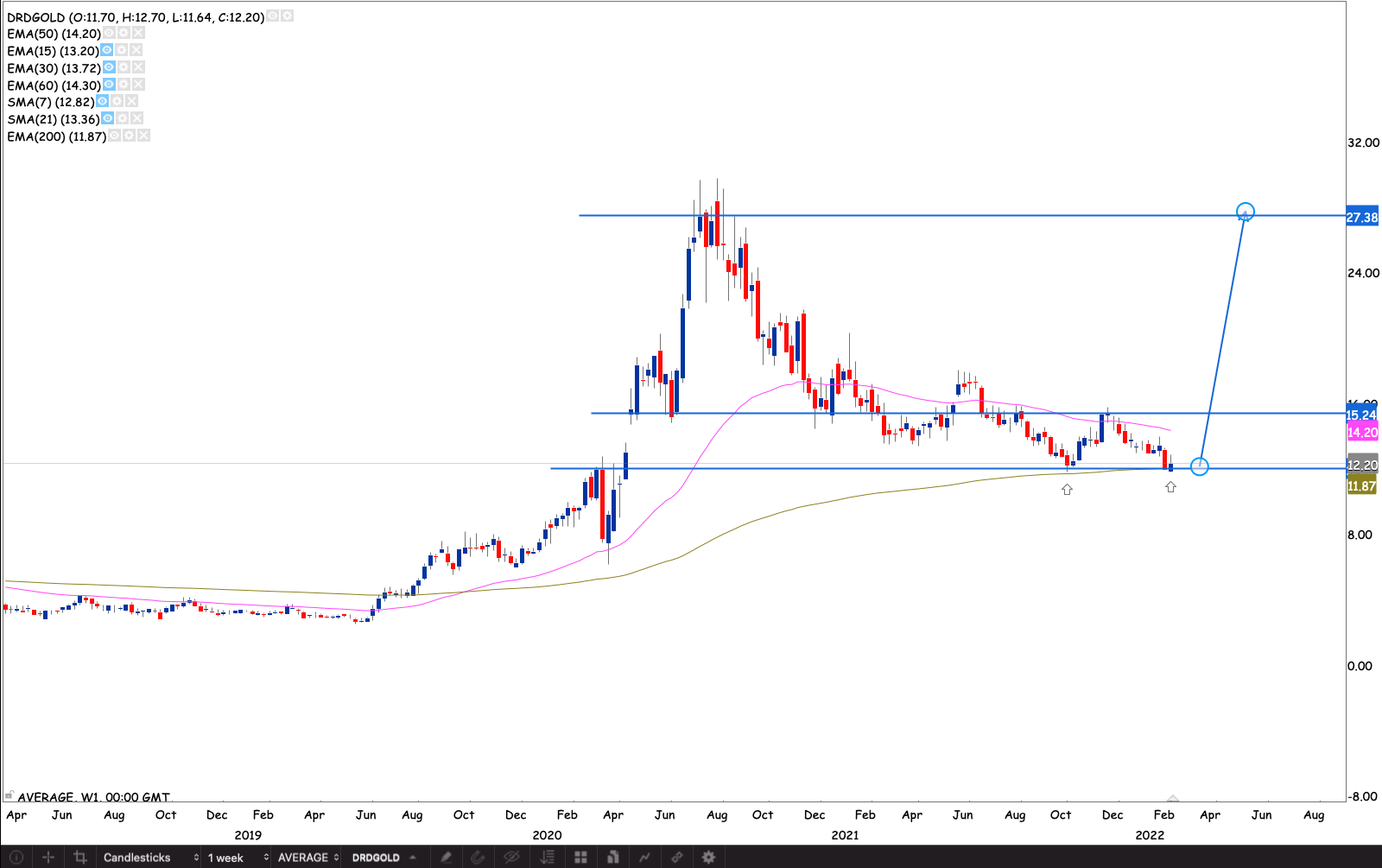 Gold stocks are showing signs of turning, helped by the bullish price action of gold. DRD developing an inverse Head & Shoulders pattern. With 15.57 serving as the neckline. With a tight stop just below the 200 day EMA at R14.30 for a R19 target.