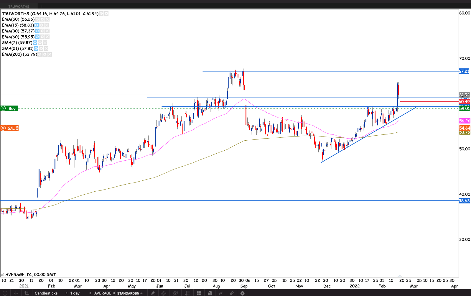 We have a nice and wide head and Shoulders pattern with a higher right shoulder. Completing the pattern with a bullish engulfing weekend breakout. I raised my stop loss to R61.23. Bringing the risk on my position to break even. I will add another 1% risk on the position with 21.9 shares.