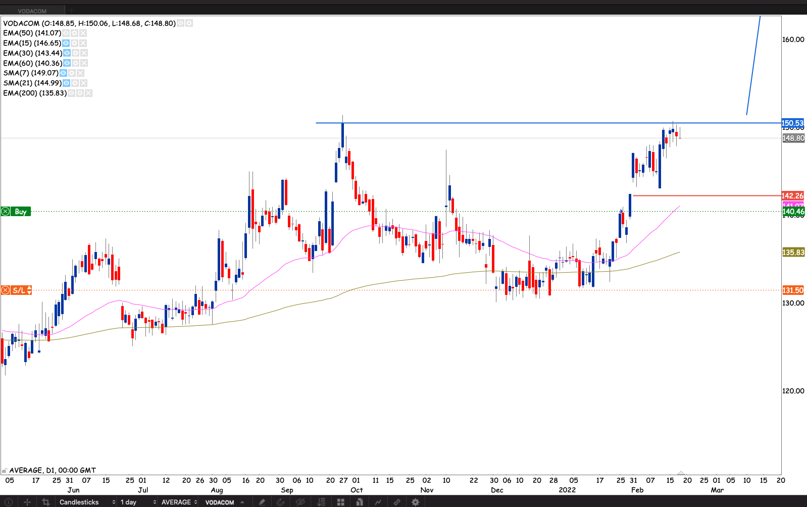 The stock legged MTN for some miles. However it woke up from the dead post results. So far the market still remembers R150.50. If the market can take out this level I will raise my stop loss and add to my position.